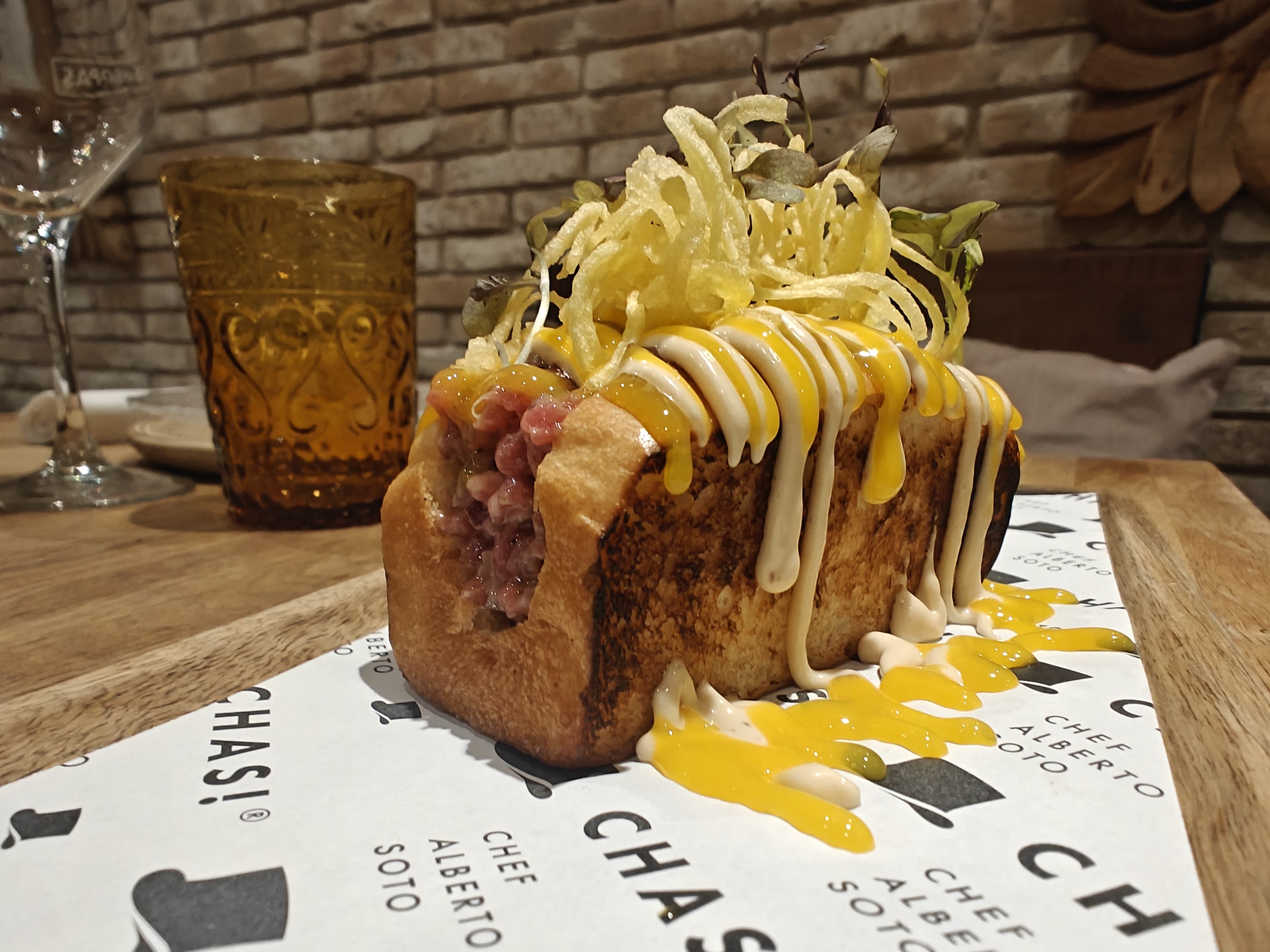 Brioche de mantequilla, relleno de Steak Tartar de solomillo, con mahonesa de anchoa, crema de yema y terminado con patata frita crujiente.