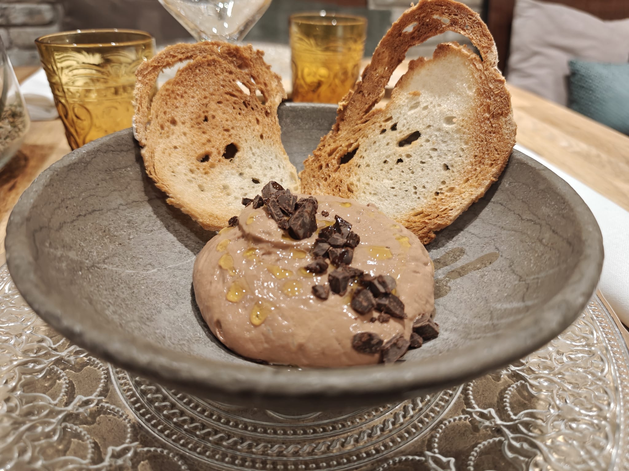 En la base un cremoso de AOVE, cubierto con un espuma de chocolate, AOVE y sal en escamas. Lo acompañamos con dos tostadas crujientes de pan.
