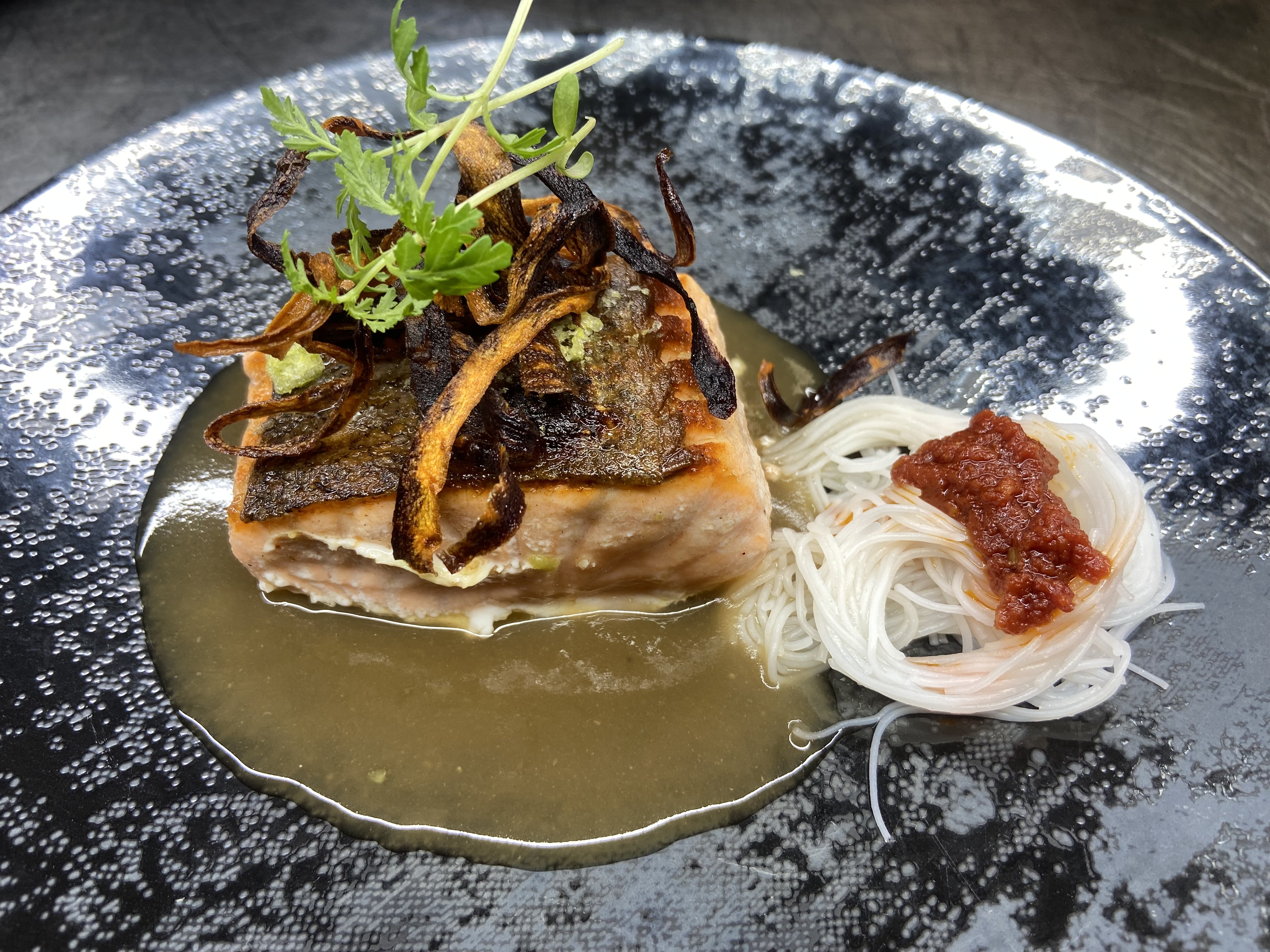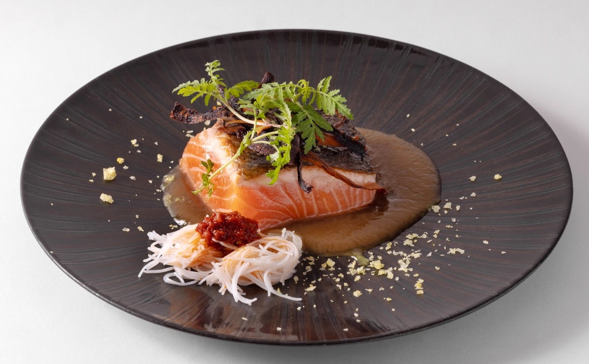 ½ **SALMÓN CON CALDO DE JAMÓN Y TOMATE CíTRICO