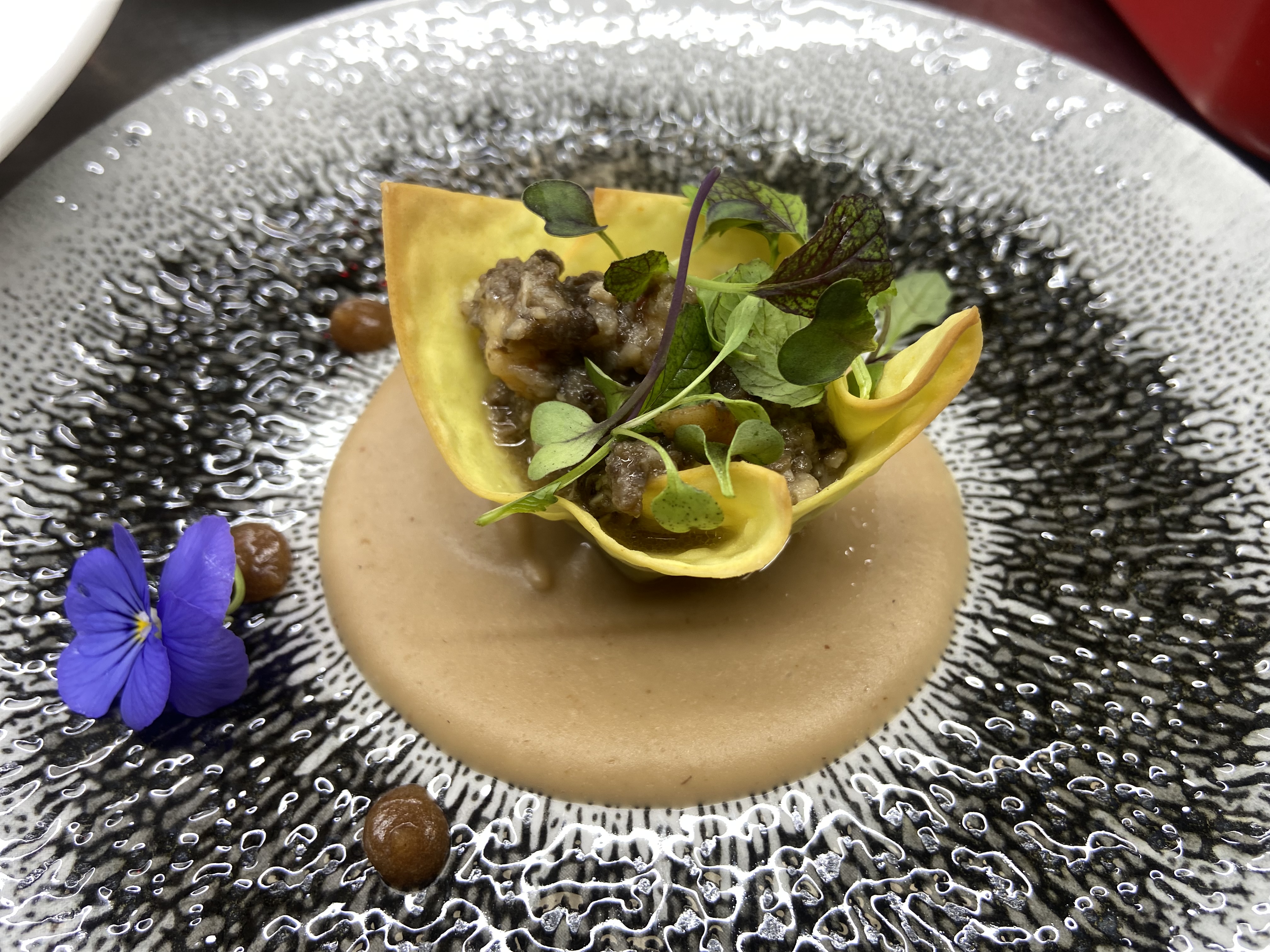 DUXELLE DE SHIITAKE/CHAMPIÑON LANGOSTINO: Shiitake, champiñón, langostino, cebolleta, sal, pimienta, mantequilla.