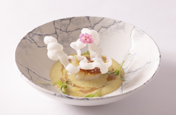½ VIEIRA CON SALSA DE JALAPEÑO Y CRUJIENTE DE ARROZ