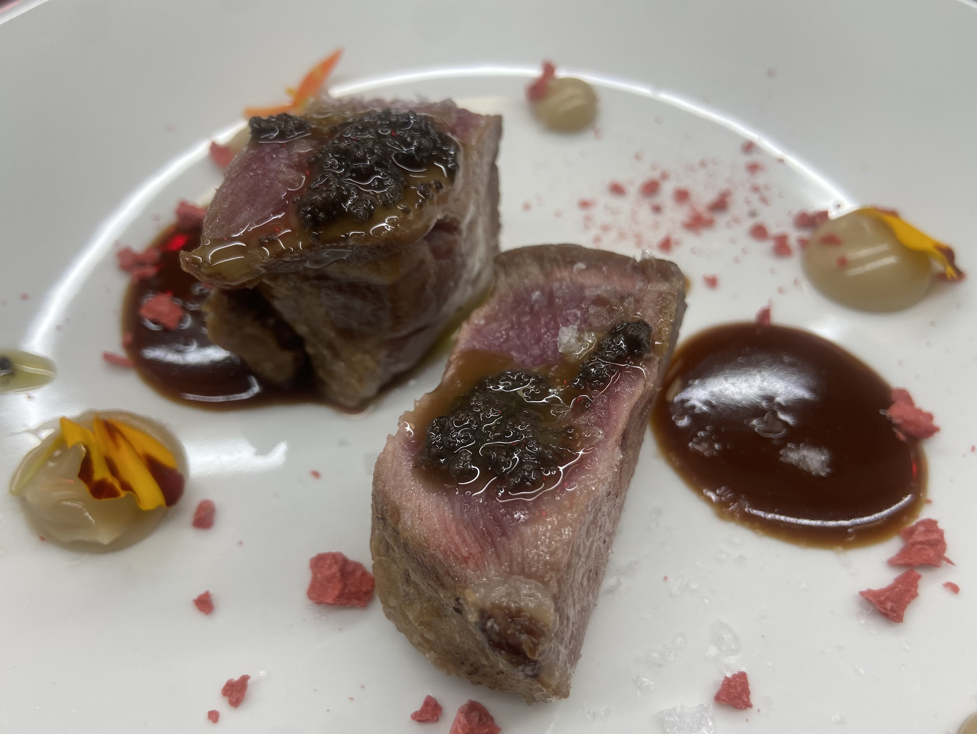 ½ **PRESA IBÉRICA CON SALSA PARÍS Y EMULSIÓN DE AJO NEGRO
