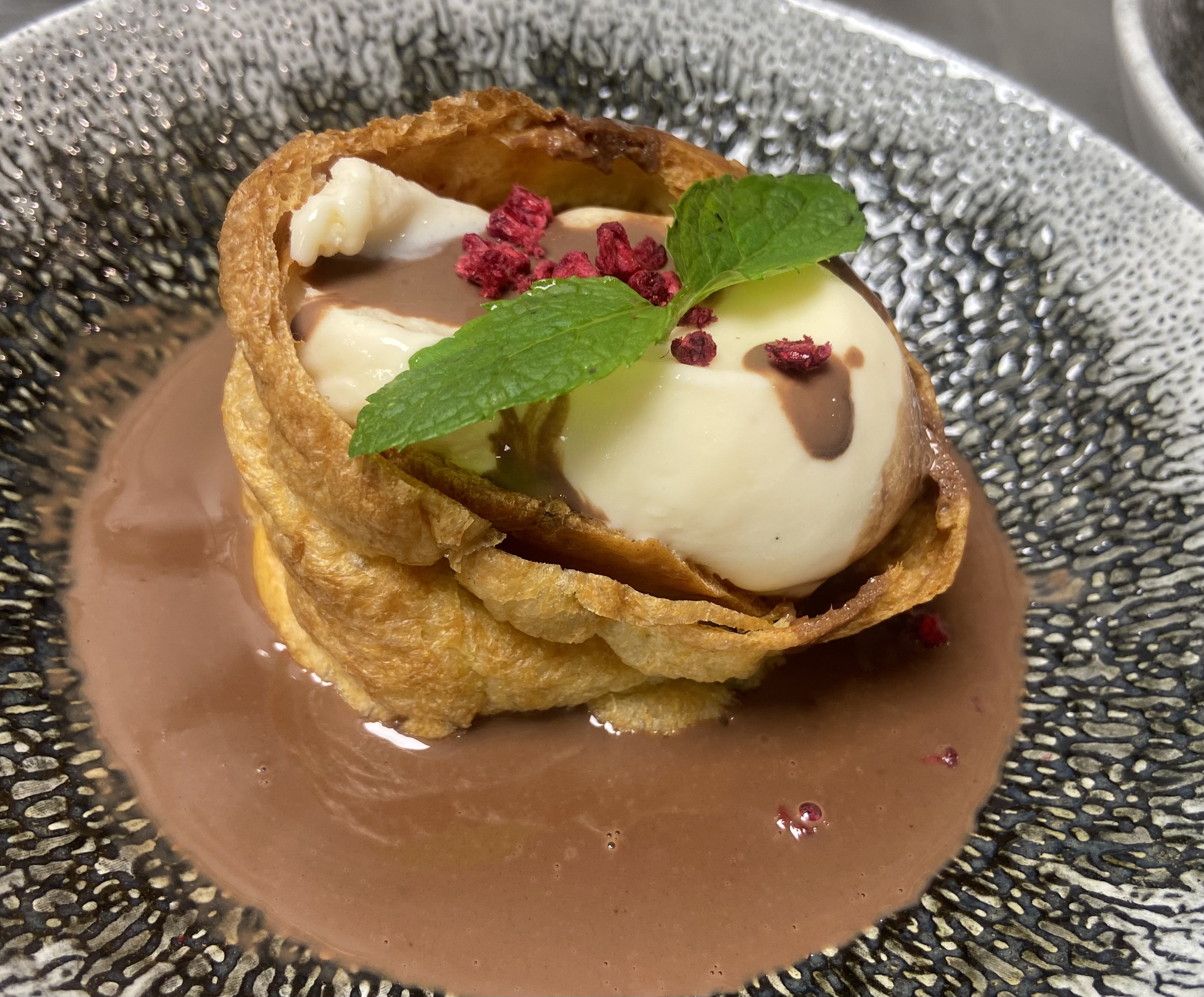 ½ *PROFITEROL RELLENO DE HELADO DE VAINILLA CON CHOCOLATE TEMPLADO
