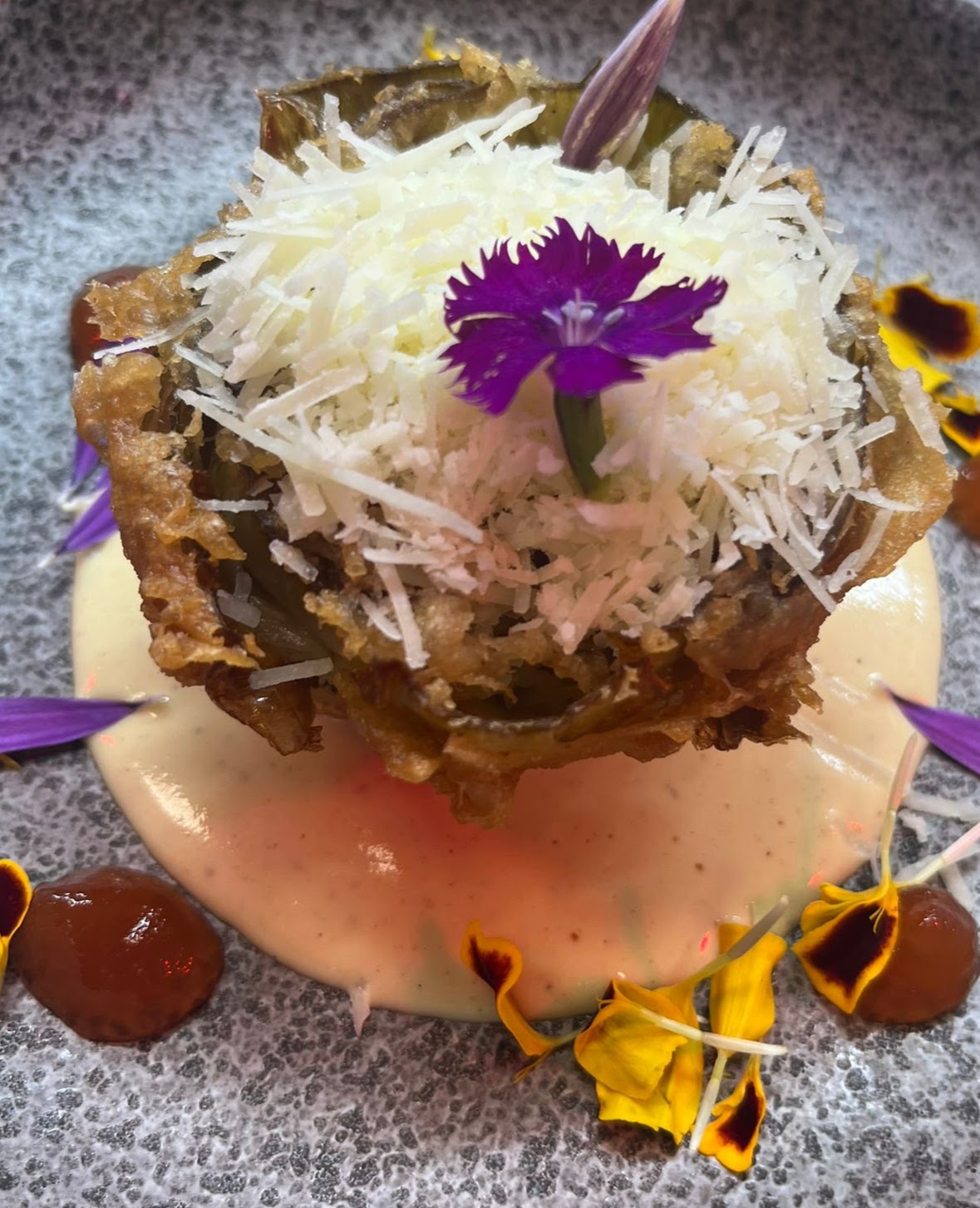 ALCACHOFA EN TEMPURA, SALSA DE MOSTAZA, MERMELADA DE TOMATE E IDIAZABAL.