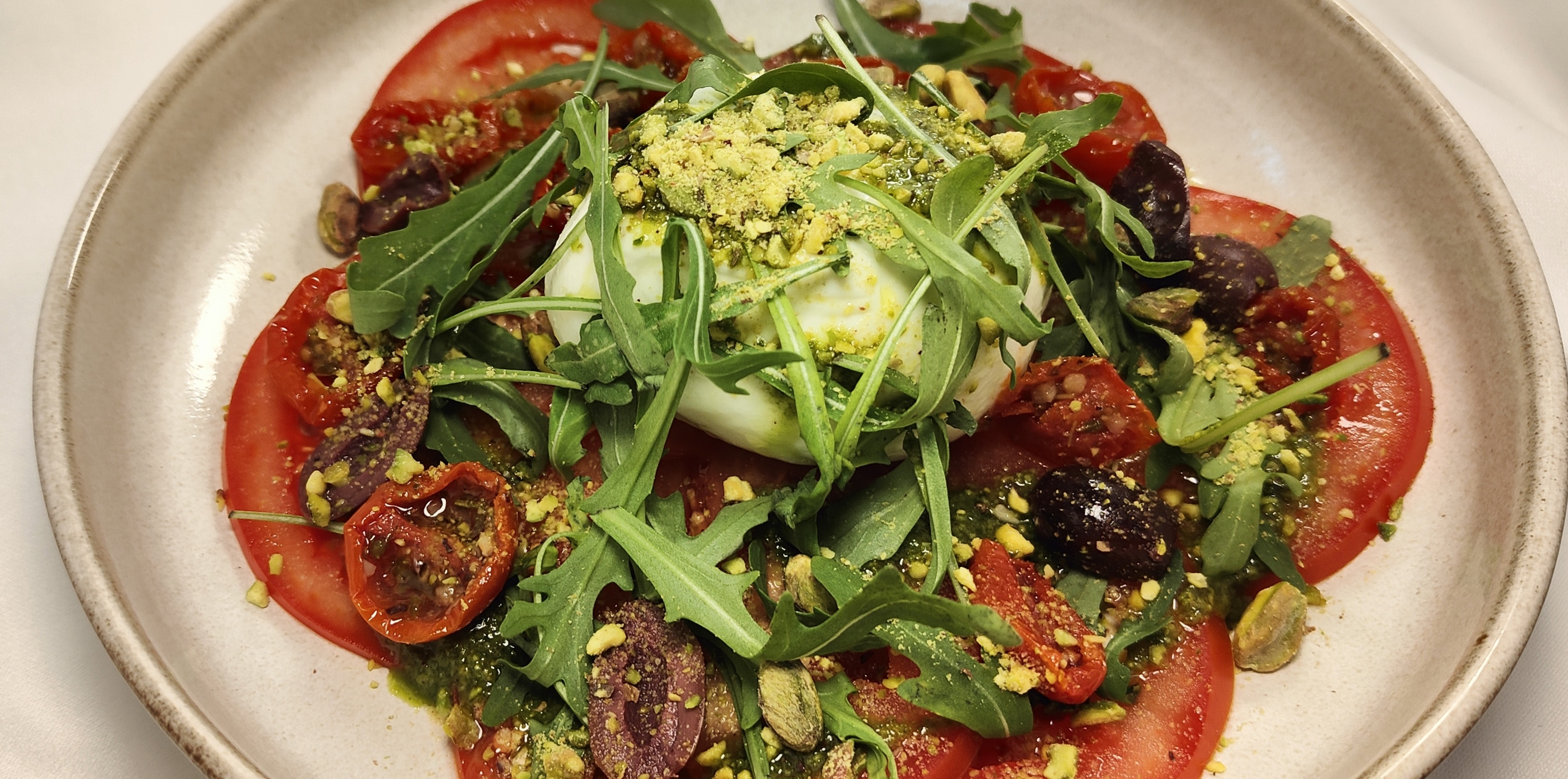 Ensalada de tomate y burrata, con aceitunas negras, tomate seco, rúcula y pistachos y albahaca