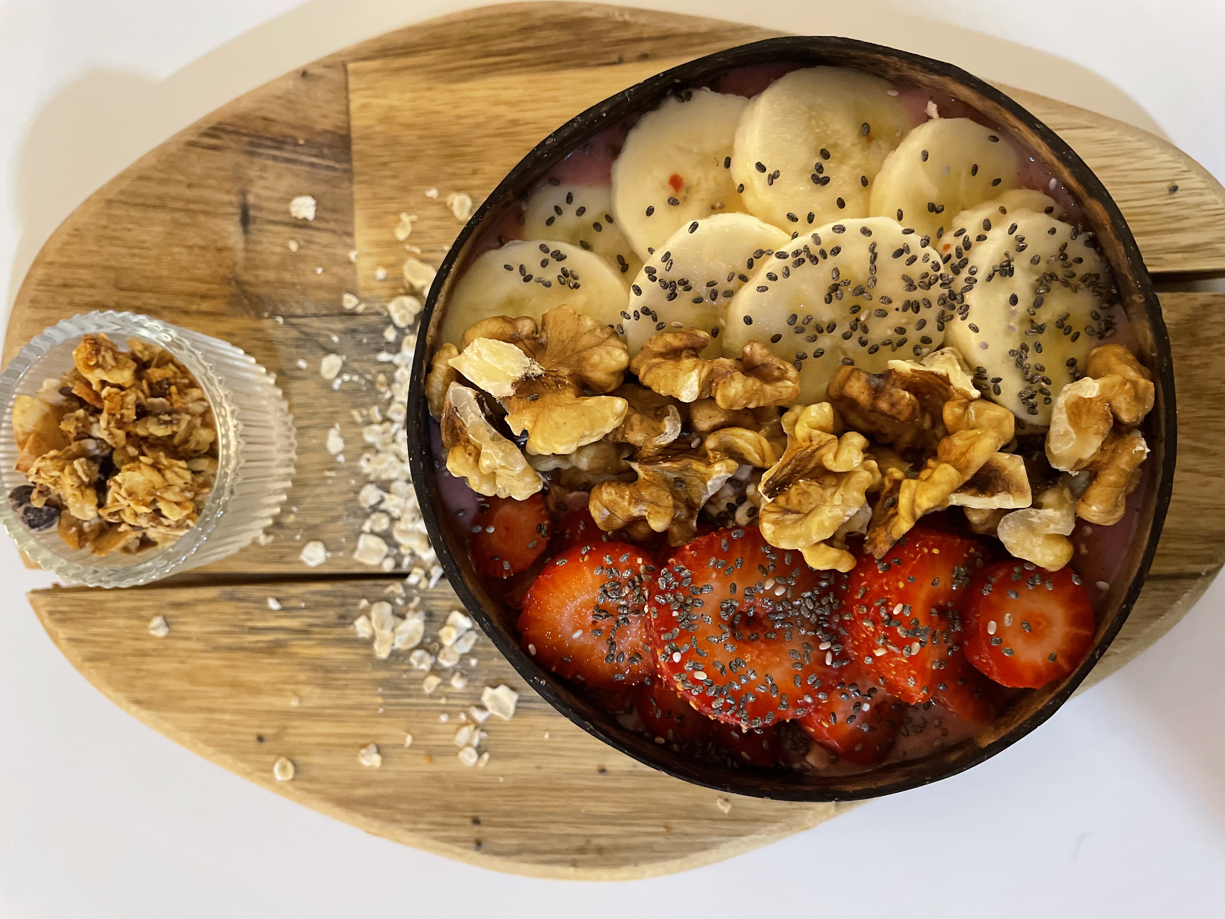 Base cremosa de fruta de açaí mezclada con leche de avena, coronada con fresas frescas, plátano laminado, nueces crujientes, copos de avena y semillas de chía. Un bowl completo, colorido y lleno de nutrientes.
